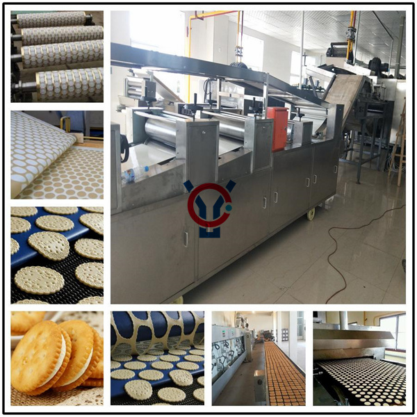 Hard biscuit production line is generally, composed of a feeding machine(if producing the soda biscuit or chocolate coated biscuit, anther lamination process is needed), a set of dough roller, through the dough rolling and dough sheet, then through the roller cutting machine, rest material recycling device, inlet oven machine, the entire biscuit forming line.